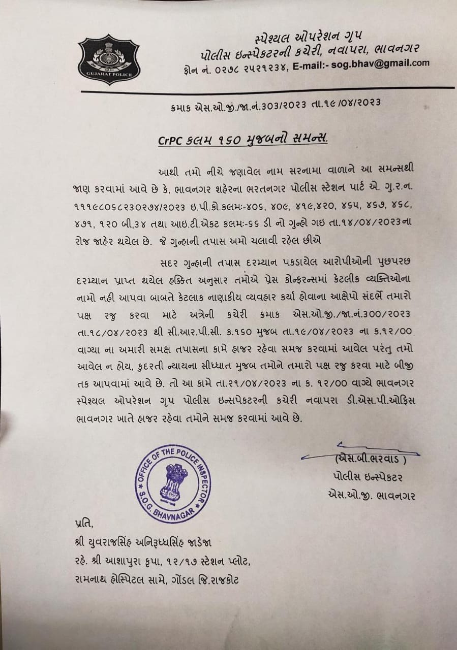 ભાવનગર પોલીસ દ્વારા નવો સમાજ કાઢવામાં આવતા યુવરાજસિંહ જાડેજા હવે તા. 21 એપ્રિલના રોજ હાજર થશે કે કેમ તે અંગે લોક ચર્ચાઓ શરૂ થઈ છે.