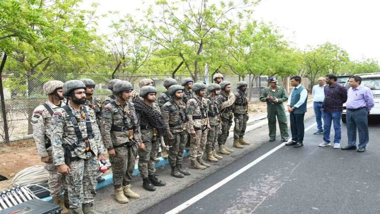 બિપરજોય વાવાઝોડાને લઈ અનેક નુકસાનના કિસ્સાઓ સામે આવ્યા છે. હાલમાં સેનાના જવાનો ફાયર સેફ્ટી થી લઈ તમામ સાધનોથી સજ્જ છે. ગરુડ ઇમરજન્સી રિસ્પોન્સ ટીમ પણ સ્ટેન્ડ ટુ રાખવામા આવી છે. મનસુખ માંડવીયાએ ખાસ ડિફેન્સ સિક્યુરિટી કોર્પની વધારાની ટીમ સાથે પણ મુલાકાત કરી હતી. આ દરમ્યાન વિંગ કમાંડર એમ. એસ. રાઠોડે મંત્રીને ટીમની વિશેષતાઓ અને સજ્જતા વિશે જાણકારી આપી હતી.