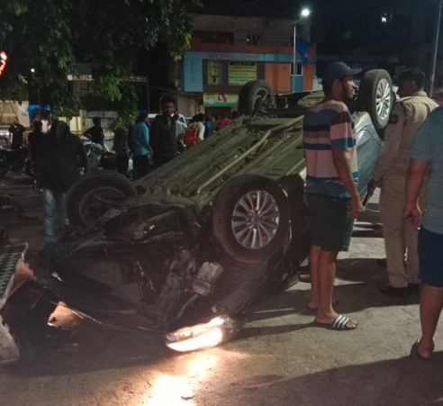 મણીનગર વિસ્તારમાં જવાહર ચોક પાસે પ્રભુ એપાર્ટમેન્ટ સામે ગઈકાલે રાત્રે કારચાલકે સ્ટિયરિંગ પરથી કાબુ ગુમાવતા કાર પલટી મારી ગઈ હતી અને બાંકડા સાથે અથડાઈ હતી. જોકે, આ બાંકડા પર બેસેલા ત્રણ વ્યક્તિઓએ સમયસૂચકતા વાપરીને પોતાનો જીવ બચાવ્યો હતો. આ અકસ્માતની ઘટનામાં કાર ચાલકને પહોંચી ઈજા પહોંચી હતી અને તે નશામાં ધૂત હોવાનું સામે આવ્યું હતું.
