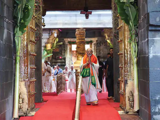 તેલંગાણામાં અનેક જાહેર સભાઓને સંબોધિત કર્યા બાદ રવિવારે સાંજે તિરુપતિ પહોંચેલા વડાપ્રધાન નરેન્દ્ર મોદીએ આજે સવારે તિરુમાલામાં શ્રી વેંકટેશ્વર મંદિરની મુલાકાત લીધી હતી. વડાપ્રધાને અહીં સંપૂર્ણ ધાર્મિક વિધિઓ સાથે પ્રાર્થના કરી હતી. આ દરમિયાન પીએમ મોદી પરંપરાગત પૂજા પોશાકમાં જોવા મળ્યા હતા.